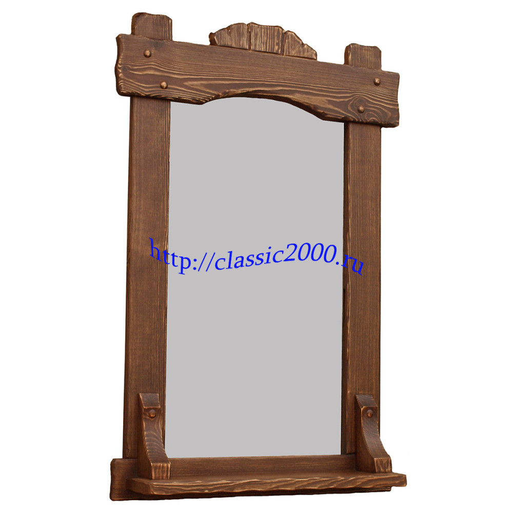 Зеркало в деревянной раме, массив сосны, брашированная под старину. Высота 120 см., ширина 70 см., длина полки 70 см, ширина полки 16 см. По желанию размеры можно изменить. Большая цветовая гамма. Хорошо впишется в интерьер бани или сауны.